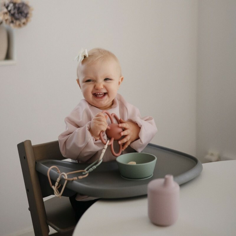 El babero con mangas Mushie Solid Dinos es un imprescindible para familias que buscan comodidad, estilo y practicidad.