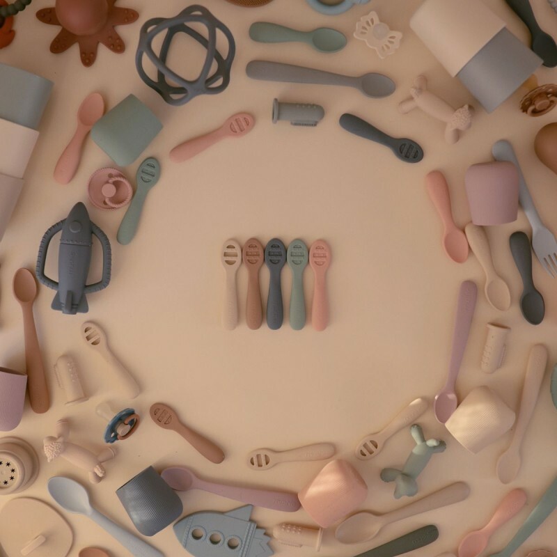 Mi primera cuchara Mushie (Pack 2) Solid Shift Sand + Tradewind – Cucharas de silicona para bebés